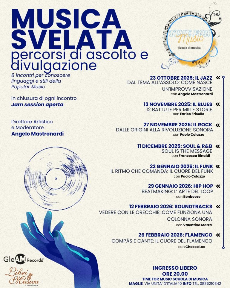 La rassegna vede il supporto di diversi partner, tra i quali l’etichetta discografica GleAM Records diretta da Angelo Mastronardi, docente di pianoforte, il quale guiderà tutti gli otto appuntamenti, grazie anche alla collaborazione degli altri docenti della scuola, musicisti conosciuti e apprezzati sul nostro territorio, tra i quali Enrico Frisullo per il blues, Paolo Colazzoper il rock, Checco Leo per il flamenco e l’ospite Bonbooze per l’hip-hop. Ingresso libero.