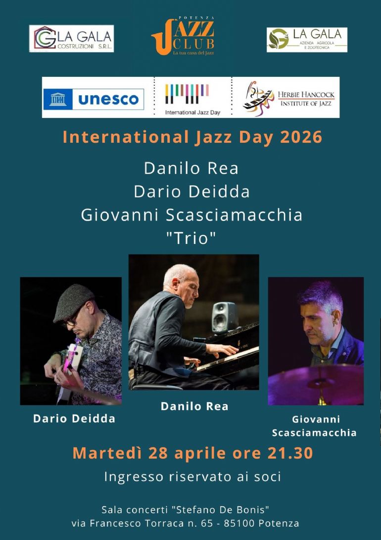 In occasione dell’International Jazz Day 2026, il Jazz Club Potenza ospita una serata di straordinario valore artistico, celebrando il linguaggio universale del jazz. MARTEDI 28 APRILE ore 21,30. INGRESSO LIMITATO E RISERVATO AI SOLI SOCI. Protagonisti del concerto saranno Danilo Rea, pianista di fama internazionale dalla poetica inconfondibile, Dario Deidda, tra i più autorevoli bassisti europei, e Giovanni Scasciamacchia alla batteria , formazione capace di coniugare energia, lirismo e ricerca contemporanea. Un incontro tra grandi personalità e visioni musicali condivise, unite dall’improvvisazione e dal dialogo creativo, per un evento che rende omaggio al jazz come spazio di libertà, ascolto e condivisione.